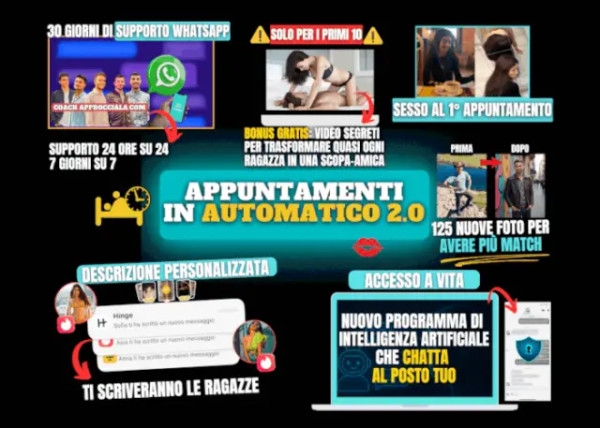 - Ti liberi dalla paura del rifiuto e dell’ansia d’approccio. Inizierai ad ottenere i primi appuntamenti e serate piccanti grazie alle app di incontri e l’intelligenza artificiale che gestirà la parte difficile al posto tuo.